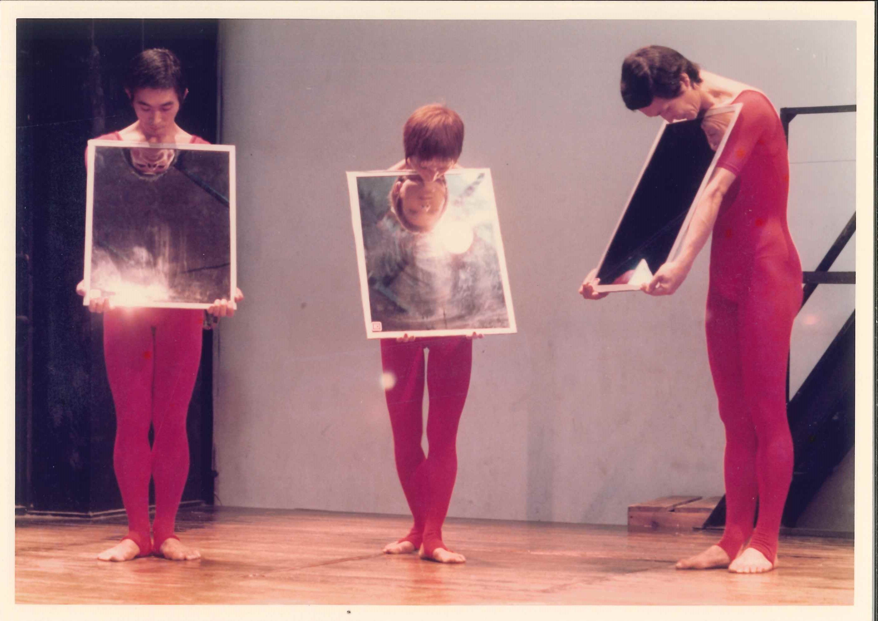 三人のダンサーは赤いタイツを着用し、大きな鏡を抱えて登場。ダンサーは鏡の中に映った像に視線を固定し、単純な動作を緩やかなテンポで交互に行う。その後、ダンサーたちは発語し、鏡に映し込んだ対象物を指差し続けながらスタジオ内を歩く。観客は声の移動と発語の内容からダンサーの動きを察知する。ダンサーたちは循環的な動きを続け、鏡を使って対象物を指差し、直視し、記憶によって発語する。最後に、ダンサーたちは床、壁、天井に対して異なる動作を同じテンポで繰り返す。動きは最初は緊張しているが、徐々に緩んでいき、最後にピアノの音が流れ、暗転。