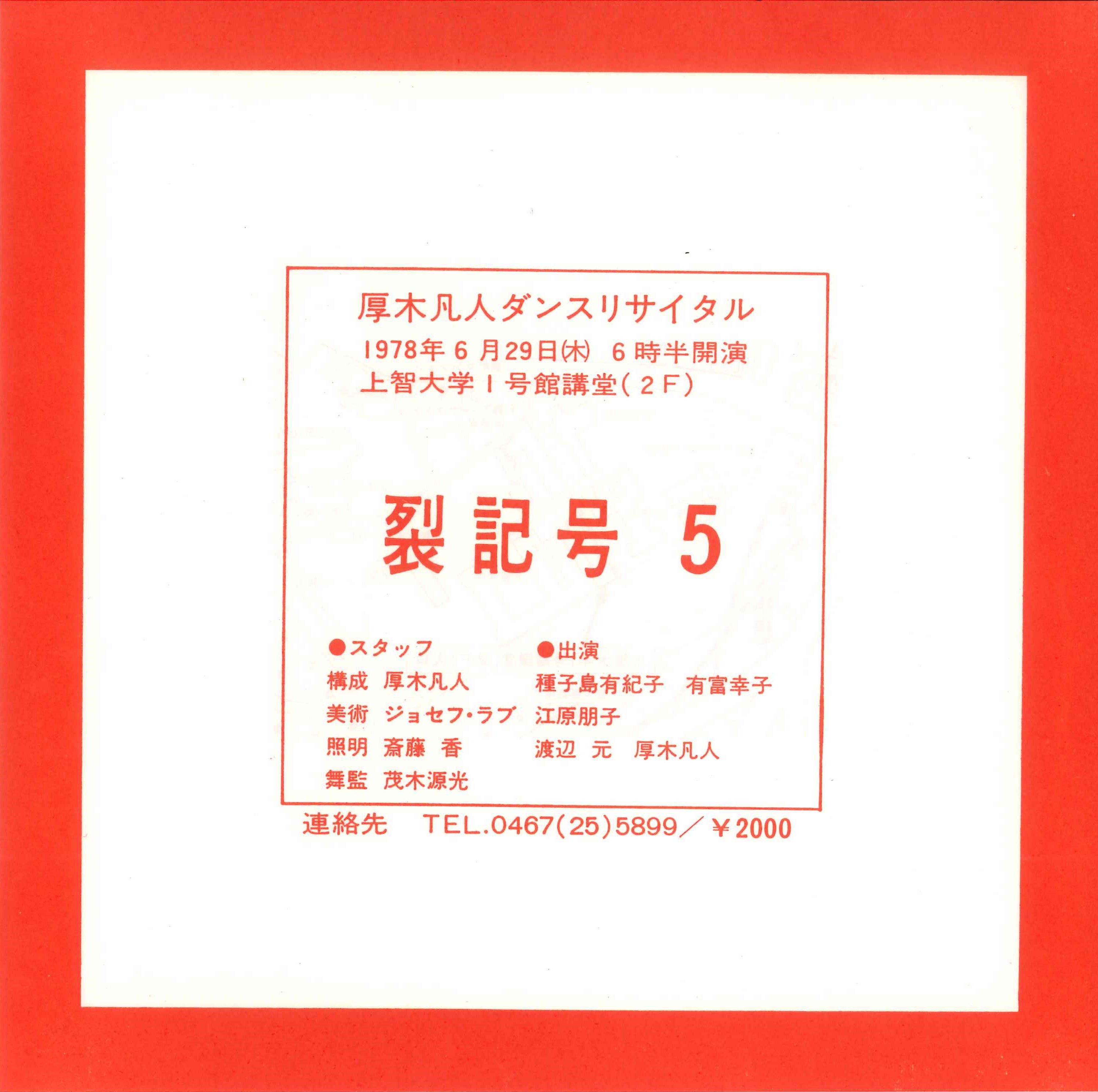 アーティスト・ユニオンシンポジウム’79参加作品。強い線の光が床を二つに区切り、5人のダンサーが激しく動きを展開する。厚木を中心に、2対のペア、渡辺元と種子島有紀子、有富幸子と江原朋子が並ぶ。