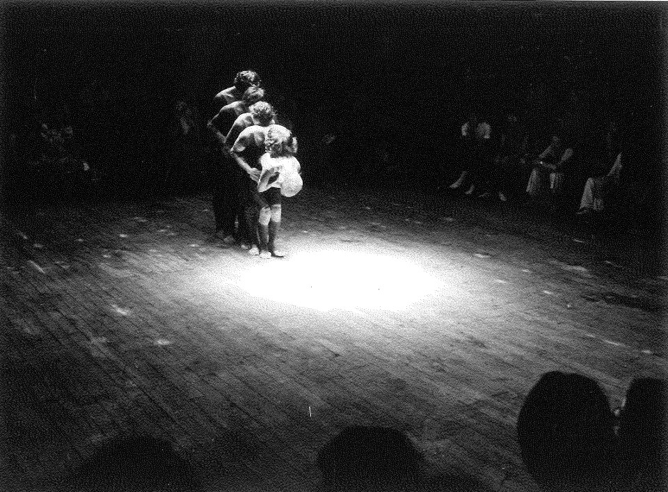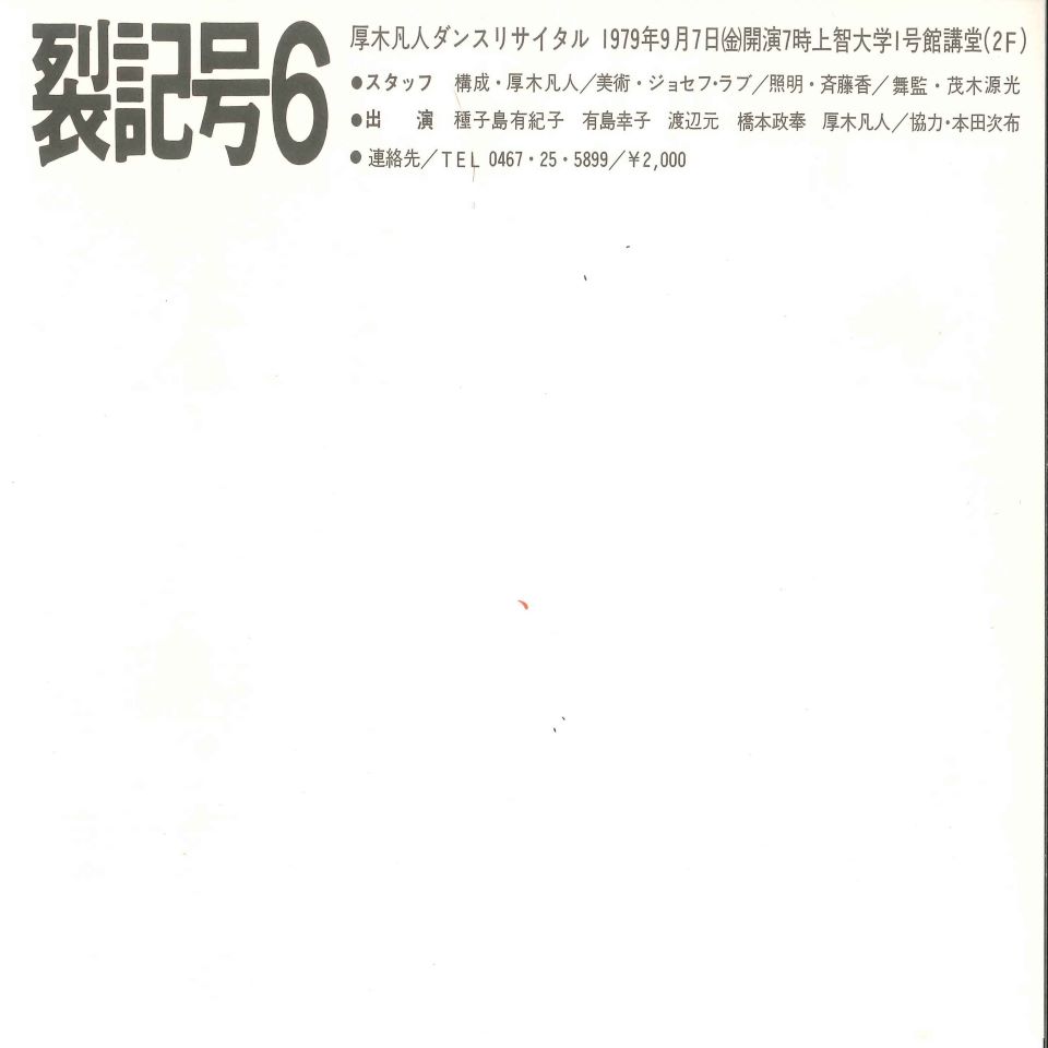 厚木凡人ダンスリサイタル。五人のダンサーが、暗がりの中、仰向けのまま足を宙にむけて回転させるところから始まる。次第に明るくなるが、この動きは続く。また肩で立ったダンサーたちが反り返ってブリッジになり、床に落ちる。足が床に鋭く大きな音を立てる。それを主軸に、手や足でしきりと床をたたく。ダンサーたちはこのフレーズを繰り返しながら円環をなす。作品の途中、五人が一列、身体を重ねるようにして並び、二、三センチというわずかな歩幅で行進する。