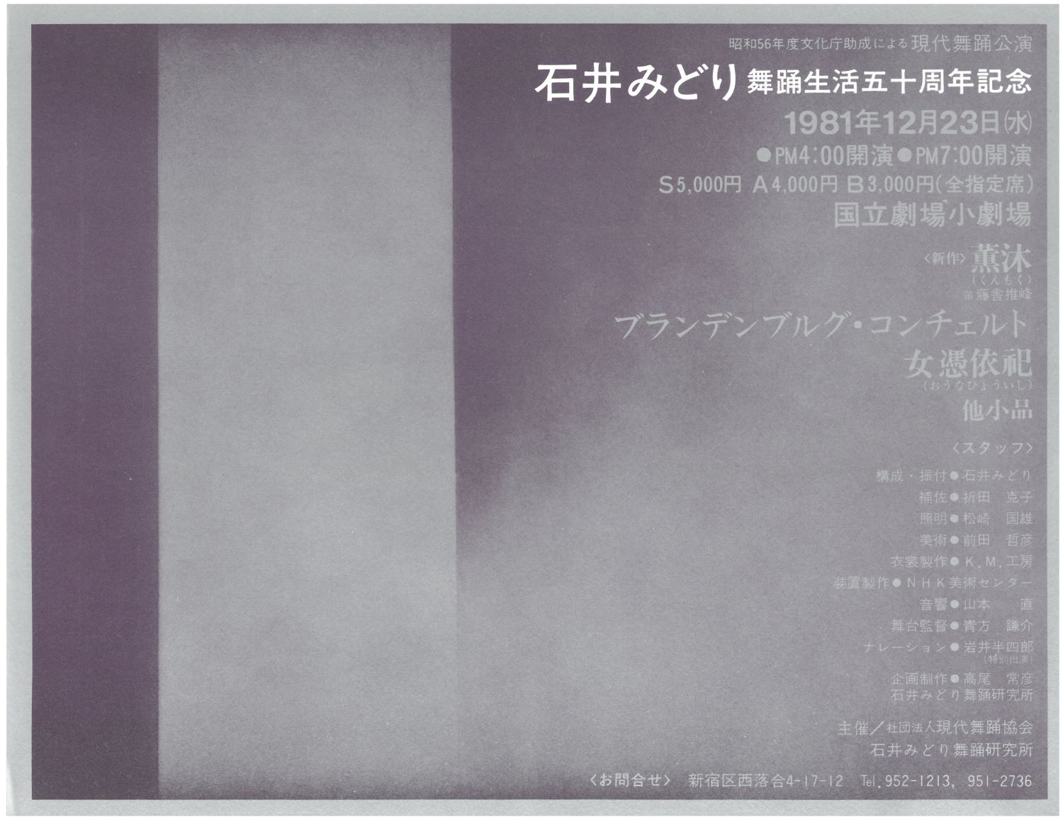 石井みどり舞踊生活五十周年記念公演の第一部を収録。小品5本(南の月、ゴリウォーグのケークウォーク、うだる、三つのテーマ、四壁)とブランデンブルグ・コンチェルトで構成された。昭和56年度文化庁助成による現代舞踊公演。