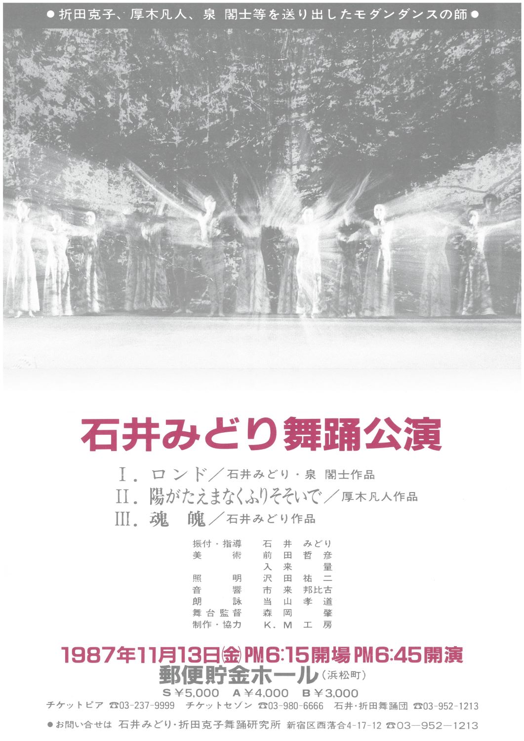 石井みどりの初期の作品に「ひめゆりの塔」があるが、時を経て直接的な表現から抽象的な表現に昇華させた作品が「魂魄」。フォーレのレクイエムを使用した鎮魂の舞で、戦争の悲惨さを憂い、また人々を踊りや音楽で癒したい気持ちが強く表れた作品である。石井は戦時中、作曲家古関裕而等と共に東南アジアに慰問公演にも行き、国内でも舞踊団として慰問公演を数多く行った。