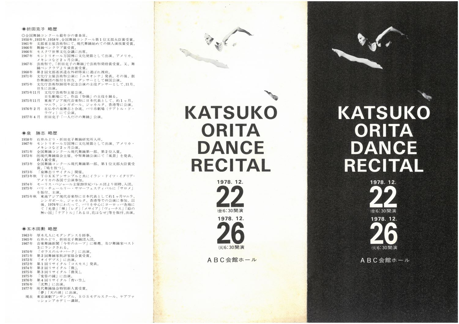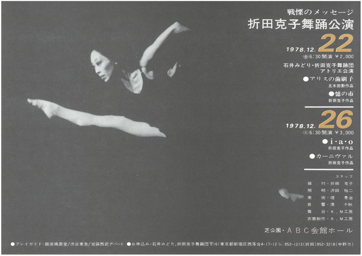 折田克子舞踊公演(石井みどり・折田克子舞踊団アトリエ公演)より。タイトルの「憶の市」とは、記憶や意識下の時間を示す。多くの人間がおりなす時代、その背景となる歴史、人間の瞬時のエネルギー、解明し尽くせない自然と人間の神秘的な部分などを、オリジナリティーあふれる現代的なタッチで表現した舞踊作品。舞踊批評家協会賞受賞。折田克子が群舞の創作をはじめた初期の作品である。