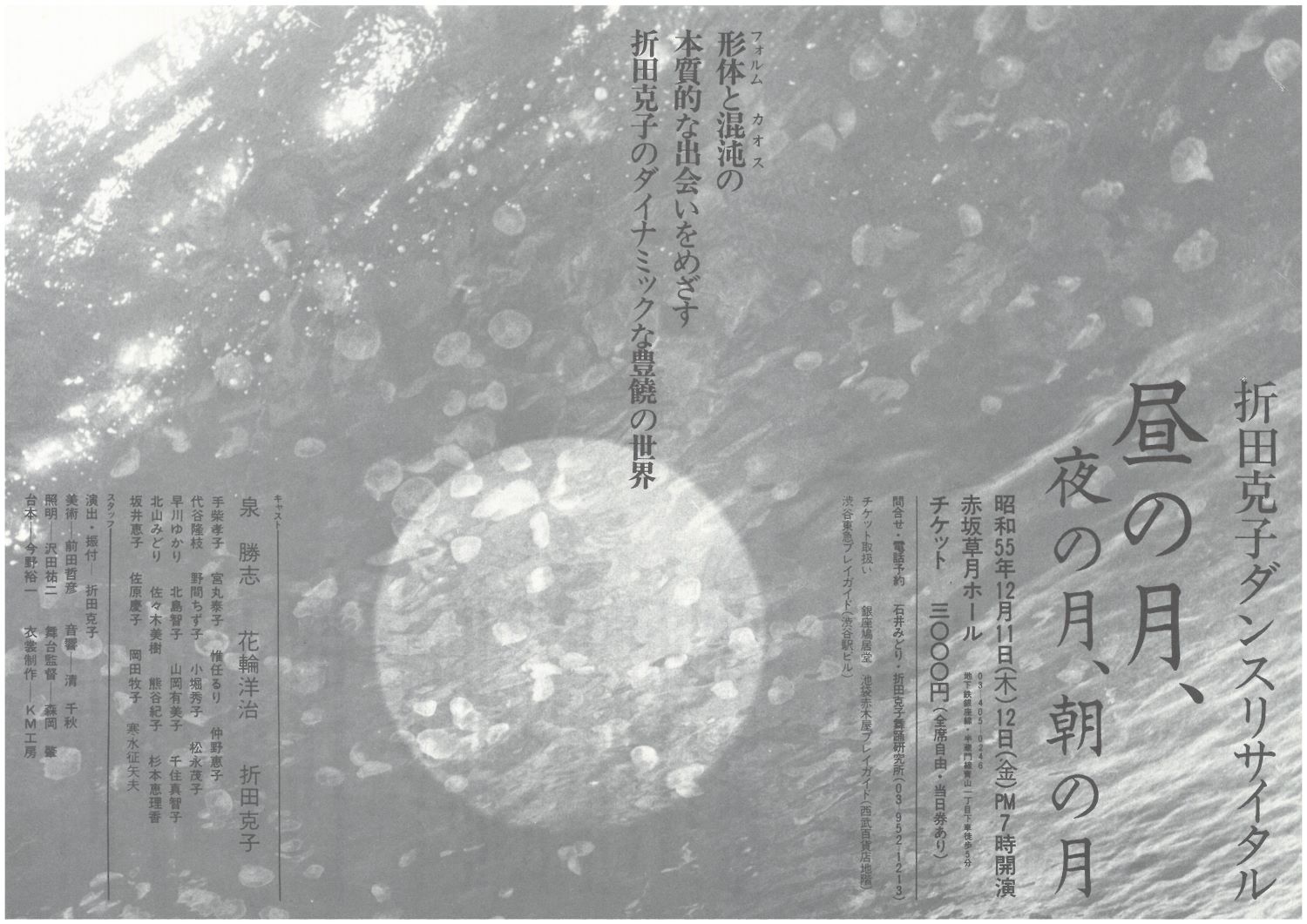 折田克子ダンスリサイタル。生きながら死んでいる少女は無数に散りばめられたパラソルに紛れ乱舞する…… パラソルは、いつしか真紅の曼珠沙華になりカラカラと風になく風車に…… 十一面観音にみとられ、少女は湖底に横たわり、虚空には夜の月がのぼる。──月をめぐり、くりひろげられる少女と青年の混沌への道行き。形体(フォルム)と混沌(カオス)の本質的な出会いをめざす折田克子のダイナミックな豊穣の世界。