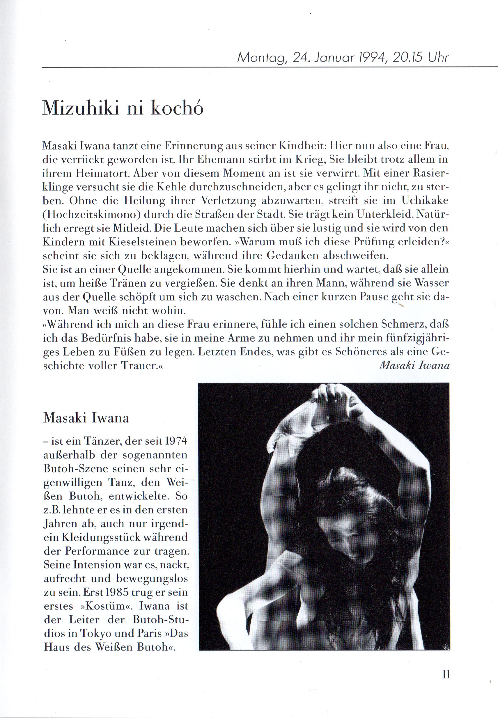 岩名雅記独舞踏。初演は1992年で、パリ、ペスカラ(イタリア)、ハニア(ギリシャ)、サンクト・ペテルスブルグ、ブカレスト、東京で上演された。映像は、1994年にドイツ・ゲッティンゲンで行われた第3回舞踏とジャズの祭典MAMU Festivalで上演した時のもの。タイトルはフランス語では「Papillon en Offrande」。岩名が子供の頃に出会った、戦争で夫を亡くして気がふれ、打掛を着て街を彷徨い歩く女性の想い出が核にある。