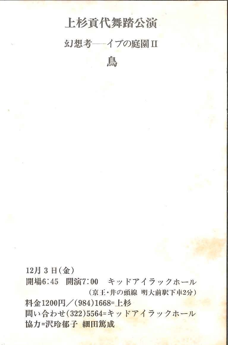 「公演時間の大半を直角に交わる二面の黒壁に沿って右から左への移動に費やされた」という本作は、「静中の動」、「内に圧縮されて解放を求めるエネルギーの迫力を醸しだし、さも鳥が天上に羽ばたきたくとも羽ばたけずに果てるかのような」姿を見る者に連想させた(吉沢伝三郎 /「現代思想」1983年1月号)。「幻想とは、何よりもまず不安を意味し、破壊を意味する」というロジェ・カイヨワの言葉が、「鳥」という作品にひとつの生命を与えている。