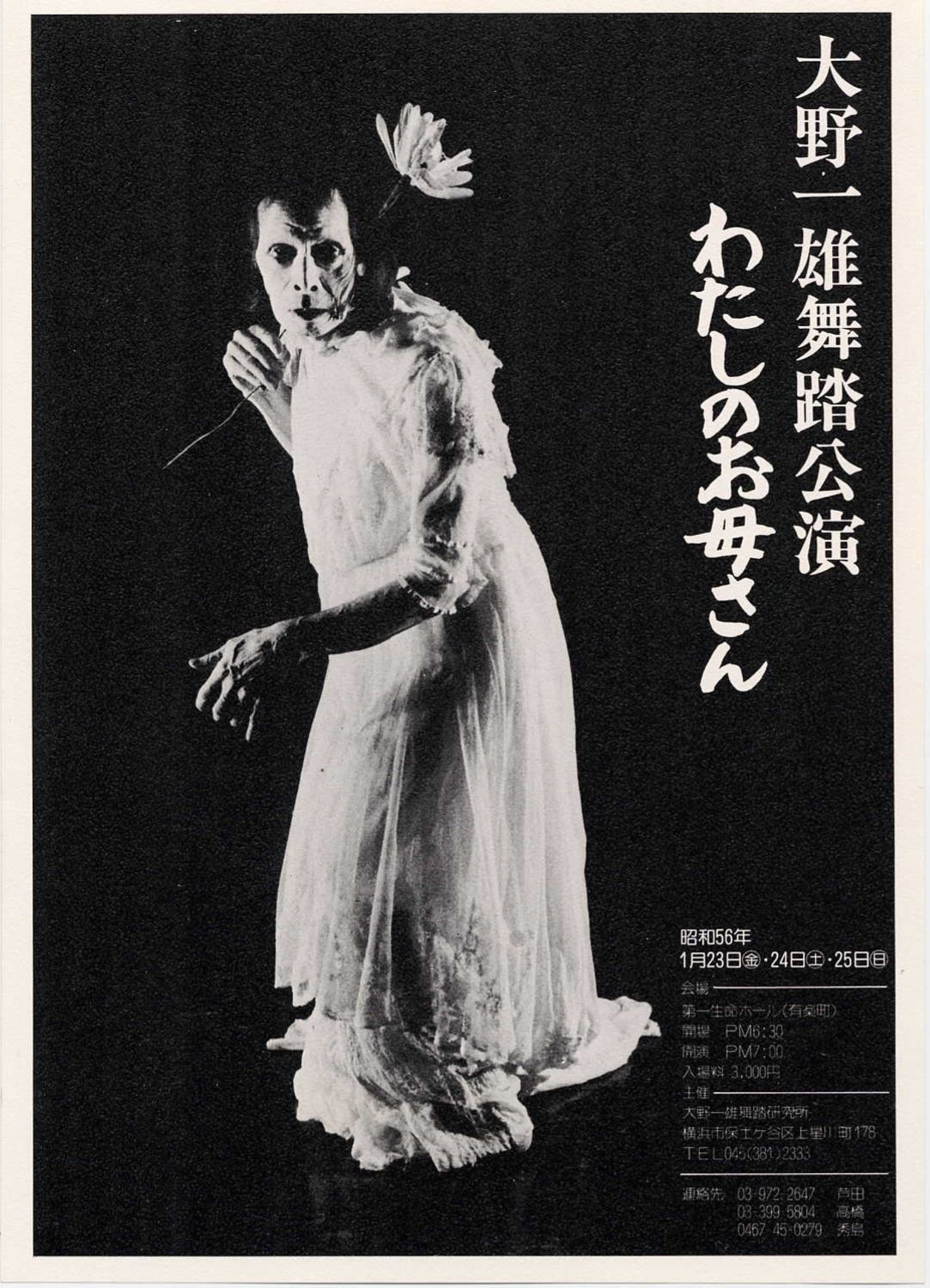 大野一雄舞踏公演。「わたしのお母さん」は、「ラ・アルヘンチーナ頌」と共に大野一雄の代表作で、1981年初演。西洋料理を得意とし、琴をよくしたモダンな母親の想い出が核となっている。プログラムには、幼い子供達を亡くし拝む母のこと(「花電車」)、死の床にある母の言葉(「遺言」)などのテキストが掲載され、具体的なモチーフを伺い知ることも可能だが、舞台上の動きは抽象的である。作品中に登場する「おぜん」は、母を象徴している。