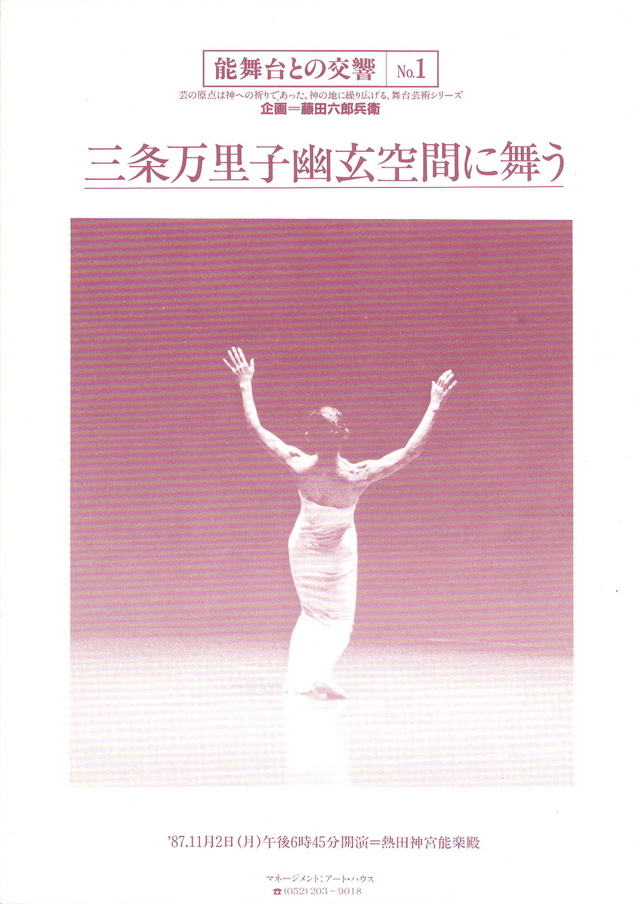 「能舞台との交響No.1」は、能楽 笛方 藤田流十一世家元藤田六郎兵衞氏により企画され、1987年11月2日に熱田神宮能楽殿で開催された。日本人が造り出した能舞台という古典空間に、現代舞踊家三条万里子が招聘された。「鳥」はプログラム最後の作品である。 1975年の9月に、作品「鳥」はニューヨークのバーナード・カレッジで初演した。一度上演すると、続けていくつもの舞台で踊るよう所望された。百人の小ホールから二千人入る*セントラルパーク・デラコルテ野外劇場まで、様々に異なる条件での「鳥」。一回ごとに、新しい作品として生まれ変わる。瞬間瞬間に、飛び散り砕ける波動のようなものと体がせめぎ合い、舞台空間の不可思議な、まさに異次元的なその場を、もう一度、もう一度と何回も希い、1994年の秋まで踊った。その中でも1987年11月2日の熱田神宮能楽殿での「鳥」は"伝統と逸脱が混在した"忘えぬ公演になった。