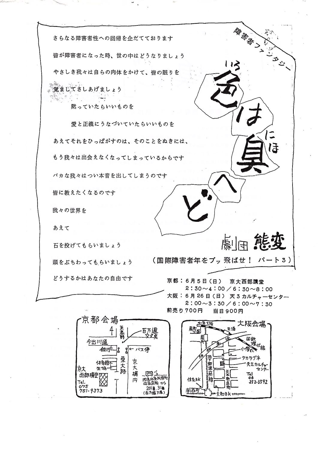 劇団態変旗揚げ作品。とかく世に否定される障害者は、自らに目覚めようとしたときから強烈な自己肯定と自己主張なしにはやってこれなかった。「障害者で何が悪い」と自らの<肉体>に伴う特有の格好、話し方、生活様式そのものを肯定する作業。これは障害者にしかできない自由な発想でなされていいはずだ。障害者が行う肉体表現として、芝居はいい方法ではないか。この初めての試みに人々を巻き込み、態変は劇的なデビューを果たした。
