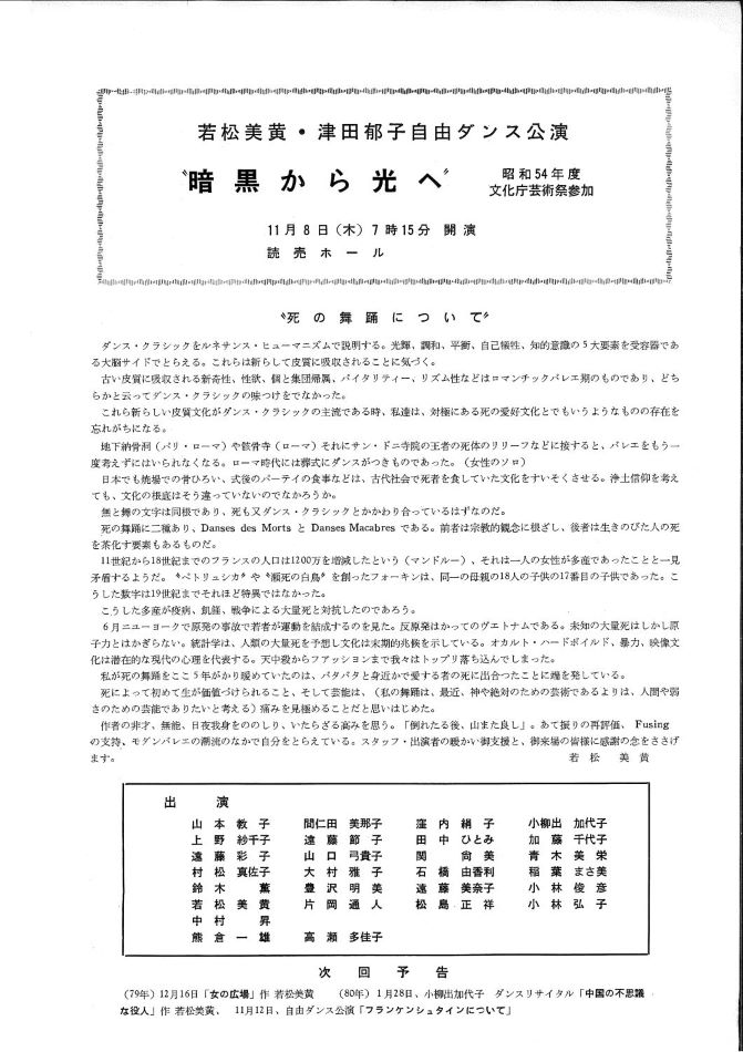 私の舞踊は最近、神や絶対者のための芸術であるより、儚い生を生きる人間や弱さのための芸能でありたいと考える。」(若松美黄ープログラムから一部書き直し抜粋)