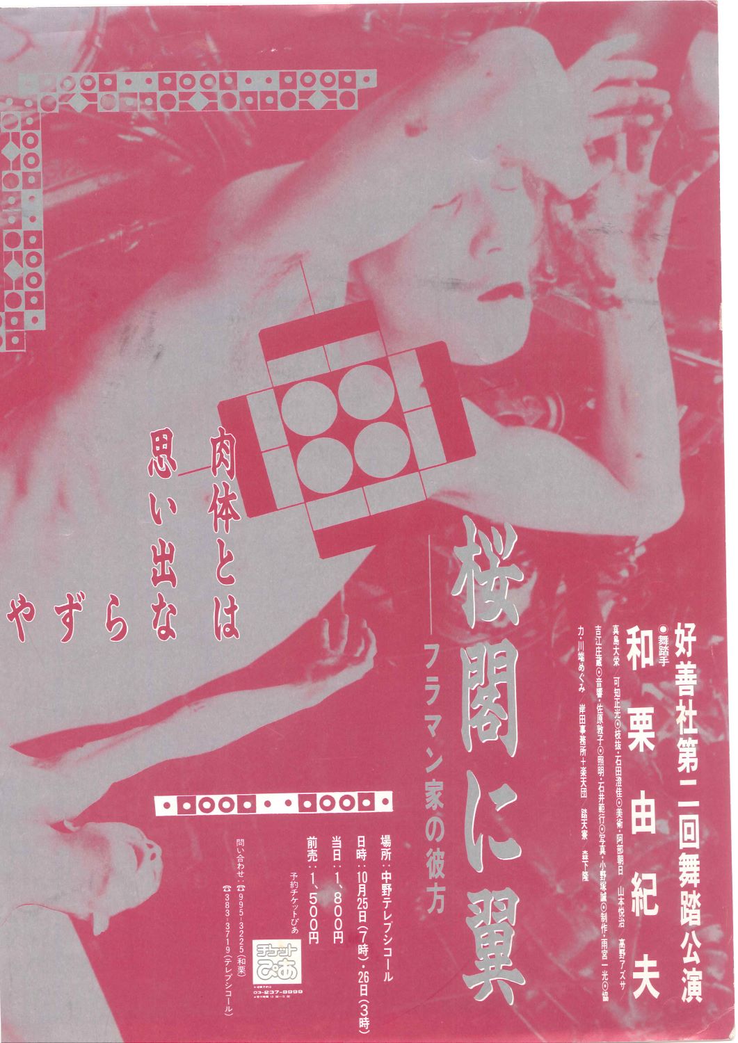 江戸小紋に染めた肉体が職人のあくなき手作業の繰り返しに顧みたものは何か。伝統を受け継ぐ行為が果たす「個」の夢の対決は。かつて、肉体に見た彼の舞踏が、江戸小紋の伝統にオーバーラップしていく気憶の軋みは。「精神の化石」を建て起こす第二弾、好善社の舞踏が久々に花を咲かせる。「個に復帰するはらわた」に「ときめく空隙」を期待する」